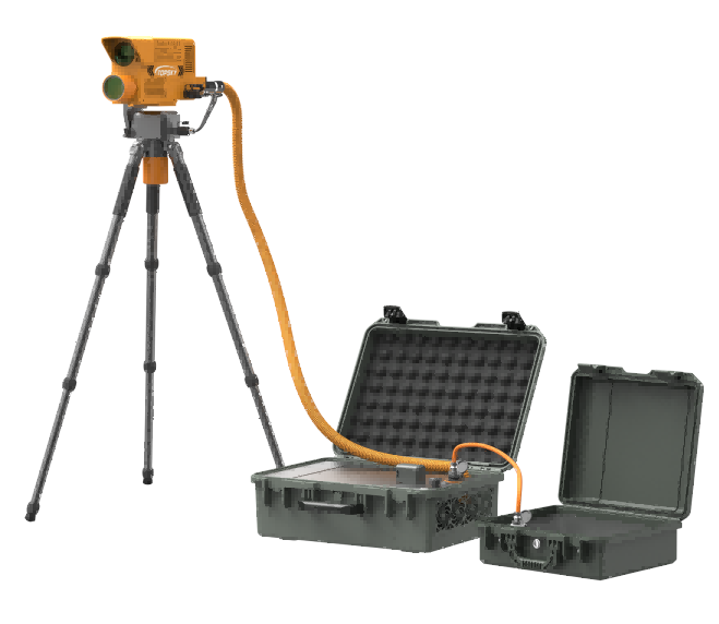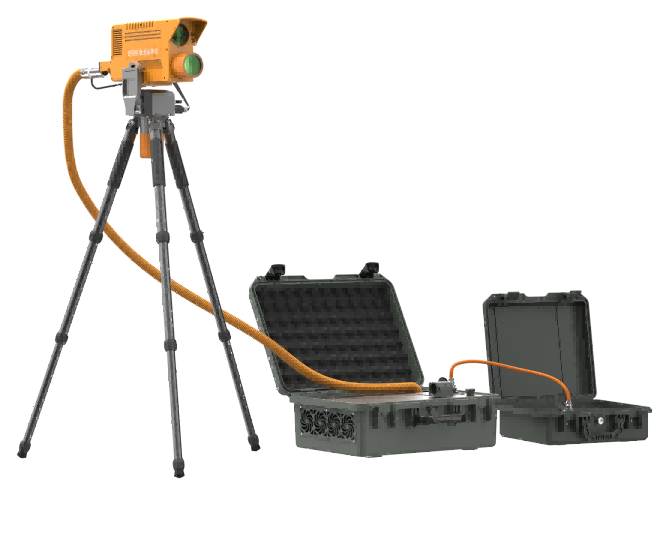 光學(xué)破拆裝置內(nèi)置高能光纖激光器,能夠從地面發(fā)射激光對鋼板、鋁板、鋼筋、彩鋼瓦、樹木、塑料、馬蜂窩等進行遠距離切割清除。
