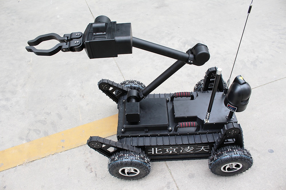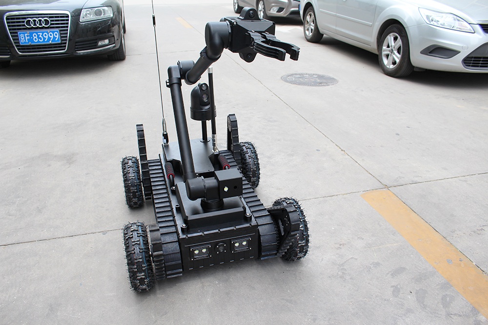 機械臂部分配備爆炸物銷毀器、瞄準(zhǔn)器,能現(xiàn)場對爆炸物進行摧毀;