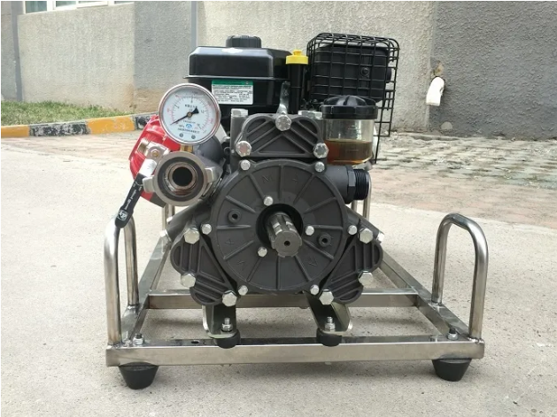 不銹鋼架,便于攜行。泵軸水平布置,減少震動。水泵泵體為柱塞液壓隔膜泵。允許砂石顆粒通過,對水質(zhì)要求低,對發(fā)動機功率損耗小。泵組可在橫向、縱向傾斜達到25°時正常工作。水帶直徑25mm,爆破壓力18MPa,表層滌綸長絲,內(nèi)襯進口橡膠,高壓森林接口連接。水泵配備的動力裝置為強制風(fēng)冷四沖程汽油機。我們的行星減速機通過特殊的處理方式,在發(fā)動機轉(zhuǎn)數(shù)超過2000轉(zhuǎn)的情況下,不會削弱發(fā)動機的動力,反而有助于發(fā)動機的動力,提高水泵的效率。