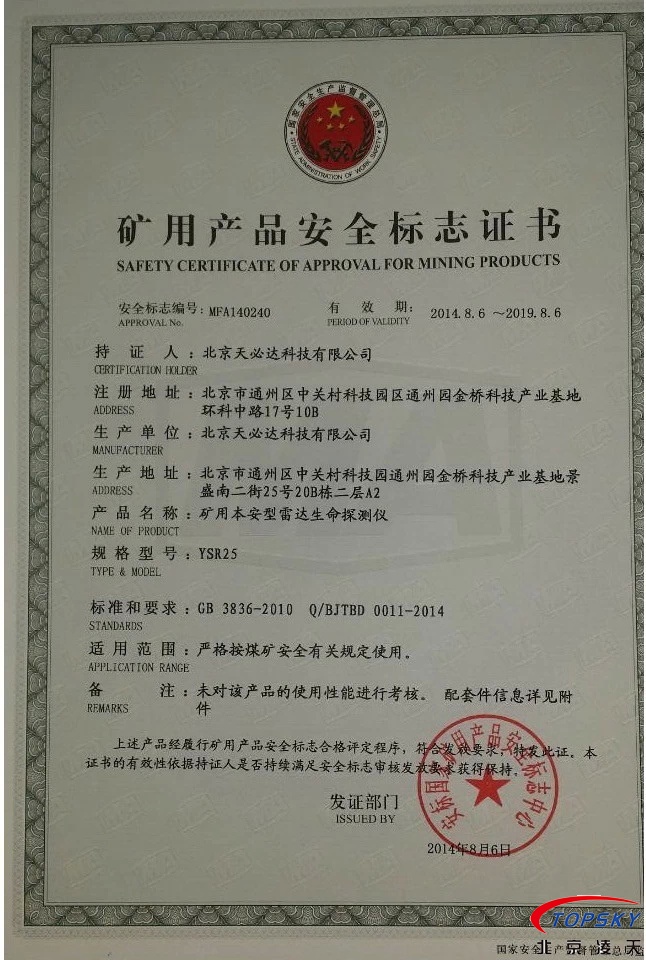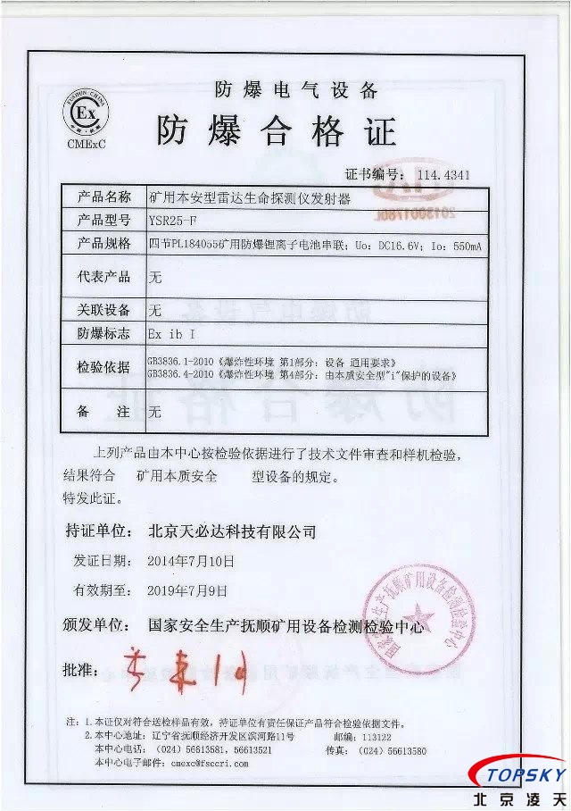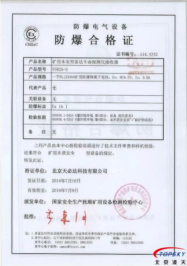 從國家安標中心獲悉,YSR25本安型雷達生命探測儀取得煤安標志認證(證書見下圖),自此,國內(nèi)本安型可用于爆炸性環(huán)境的探人雷達取得完整下井資質(zhì),從研制方獲悉,該設(shè)備已在山西陽泉煤業(yè)集團救護大隊、山西潞安集團救護大隊、開灤集團救護大隊進行過工業(yè)性試驗,試驗效果良好,探測距離達到25米(報告見下圖)!