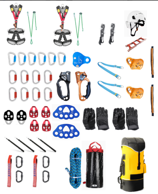 用于輔助救援人員進(jìn)行攀爬以及搭建救援通道搶救和運送傷員。包含繩索手套、山岳救援頭盔、頭燈、護目鏡、全身式安全吊帶、安全繩、安全鉤、上升器、抓繩器、下降器、滑輪、連接帶、 緩沖器等。