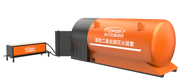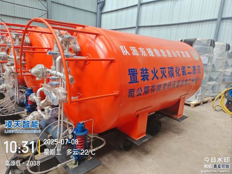 液態(tài)二氧化碳滅火裝置,采用平板車為運(yùn)載平臺(tái),搭載液態(tài)二氧化碳滅火模塊,采用液態(tài)二氧化碳為滅火劑,運(yùn)輸至井下火區(qū)近附,經(jīng)自增壓調(diào)控系統(tǒng)實(shí)現(xiàn)罐內(nèi)穩(wěn)壓,并通過(guò)遠(yuǎn)距離輸送管路將液體從罐內(nèi)向密閉火區(qū)噴射,利用其急速膨脹氣化和吸熱效率高的物理特性,可實(shí)現(xiàn)惰性降氧,吸熱降溫,吸附阻化等功能,從而可快速進(jìn)行井下煤層自燃火災(zāi)的預(yù)防與撲滅等。