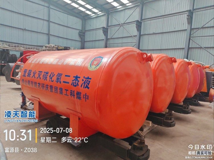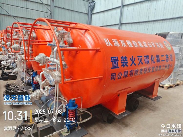 液態(tài)二氧化碳滅火裝置,采用平板車為運載平臺,搭載液態(tài)二氧化碳滅火模塊,采用液態(tài)二氧化碳為滅火劑,運輸至井下火區(qū)近附,經自增壓調控系統(tǒng)實現罐內穩(wěn)壓,并通過遠距離輸送管路將液體從罐內向密閉火區(qū)噴射,利用其急速膨脹氣化和吸熱效率高的物理特性,可實現惰性降氧,吸熱降溫,吸附阻化等功能,從而可快速進行井下煤層自燃火災的預防與撲滅等。
