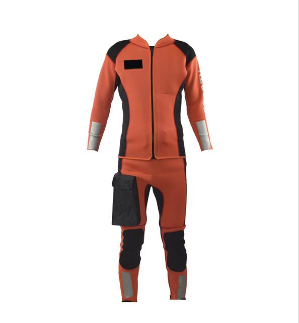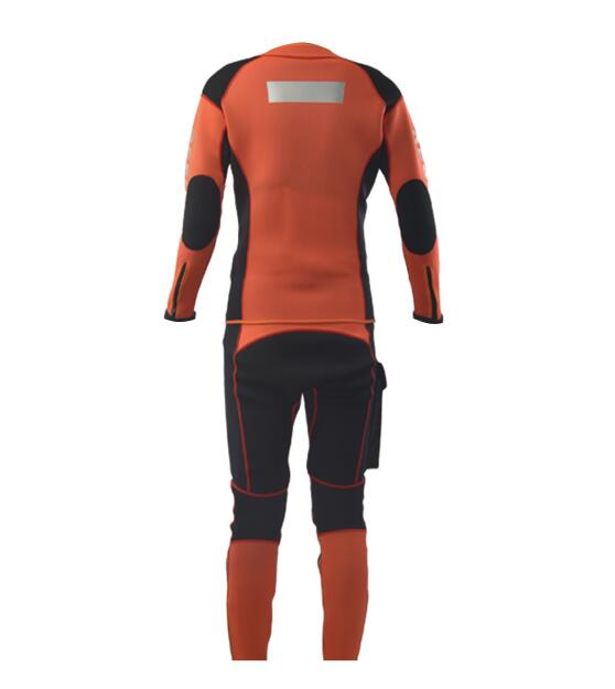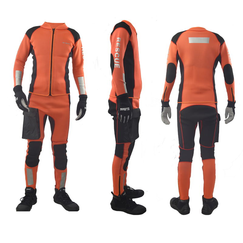 水域救援專用分體式濕式服,前開拉鏈長袖上衣和中腰褲兩件套。3mm高彈氯丁橡膠面料制作,相拼3mm超彈氯丁橡膠面料,有效的提升運動的自由度。無極調(diào)節(jié)尼龍戰(zhàn)術(shù)腰帶和高強度塑鋼插扣,防止衣服滑落。右腿外側(cè)設有一個防水尼龍面料立體口袋,臀部一片式、護膝、護肘易摩擦部位,均采用彈性聚酯纖維復合面料,增加救援服的耐磨性。衣袖、褲口及背后都設有彈性反光帶。領口、袖口及褲口處YKK拉鏈開合。