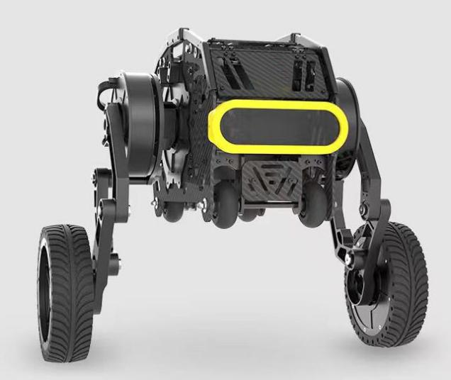 本款雙足機器人是一種足部裝有動力輪子的雙足平衡式移動機器人。這臺機器人可以將輪式機器人的速度優(yōu)勢,和足式機器人的機動越障性能結(jié)合,可以在多地形下高效、靈活的運動。這種機器人也是當(dāng)下學(xué)術(shù)研究的熱點。機器人的腿部和機體結(jié)構(gòu)由本末科技自主研發(fā)設(shè)計,總共由六個直驅(qū)型關(guān)節(jié)電機M1502D驅(qū)動。