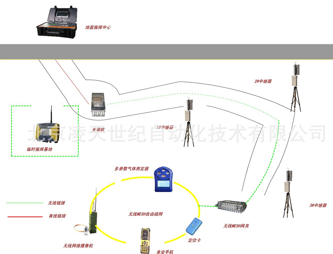 它不需要依賴管道等介質(zhì),不同與泄露通信,特別適合于搶險救災(zāi),與國內(nèi)外同類產(chǎn)品相比。該裝置輕巧便攜,能在隧道、地下建筑和復(fù)雜建筑群的地方無線傳送語音和災(zāi)區(qū)環(huán)境信息。無線發(fā)射器及攝像頭,由救護隊員隨身攜帶,它可以實時地將現(xiàn)場的音視頻信息傳輸?shù)交荆驹賹⑿盘杺鞯降孛嬷笓]中心。井下災(zāi)區(qū)的救護隊員、井下救援基地和地面指揮中心之間可進行實時信息溝通,救援全過程的圖像、語音資料可完整儲存并回放,為今后進行事故原因分析、總結(jié)搶險救災(zāi)經(jīng)驗教訓(xùn)提供基礎(chǔ)資料。若同時連接互聯(lián)網(wǎng),救援指揮中心及指導(dǎo)專家可實時了解災(zāi)區(qū)救援情況。
