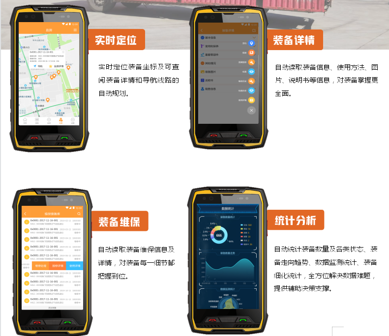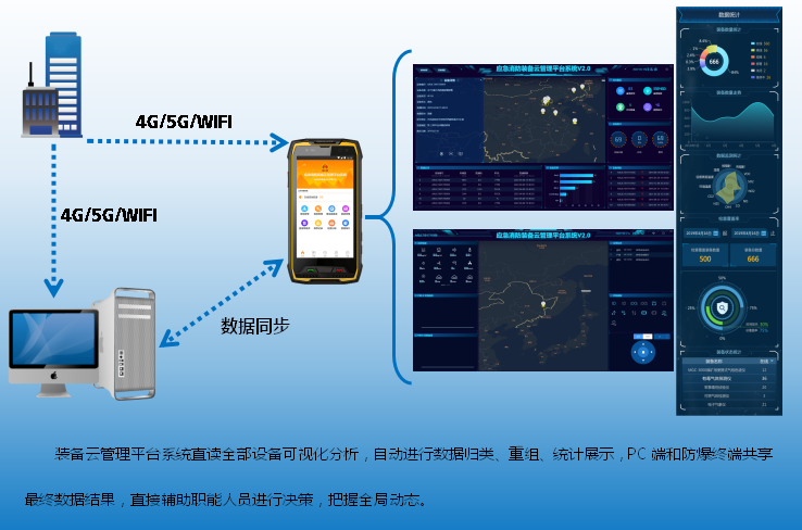 應(yīng)急消防裝備云管理平臺系統(tǒng)能夠直接通過職能人員手持的防爆終端,直接讀取系統(tǒng)內(nèi)所有的裝備、設(shè)備及具體的詳情、圖片、位置、傳輸?shù)臄?shù)據(jù),根據(jù)裝備具有特性進(jìn)行實(shí)時在線監(jiān)測,當(dāng)監(jiān)測到的數(shù)據(jù)超標(biāo)時,實(shí)時進(jìn)行報警及查閱報警信息。該平臺系統(tǒng)能夠結(jié)合智能防爆終端本身功能、北斗定位/GPS定位、錄像、拍照等進(jìn)行信息存儲,隨時隨地查閱裝備庫、維修庫、報廢庫等級占比利用率分析,最終進(jìn)行數(shù)據(jù)統(tǒng)計分析處理。此外該系統(tǒng)支持本地化業(yè)務(wù)拓展,如:現(xiàn)場監(jiān)控、無線打印,保障此平臺系統(tǒng)在不同環(huán)境中的應(yīng)用與融合。