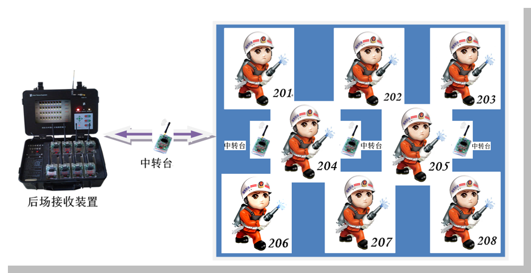 指揮員可根據(jù)監(jiān)視的情況,發(fā)出單呼巡查,群呼巡查,單呼撤退,群呼撤退的指令。呼救器佩戴人員可實(shí)時(shí)接收指令,通過聲響提示查看巡查和撤退的狀態(tài),實(shí)時(shí) 互動回應(yīng),為指揮員直觀判斷現(xiàn)場的情況,提供非??煽康闹笓]依據(jù)。該設(shè)備配套的呼救器具有遠(yuǎn)距離數(shù)據(jù)通信功能,具有群組獨(dú)立使用的功能。其中一個(gè)呼救器報(bào)警,群組呼救器都能有聲響提示,顯示報(bào)警的編組編號,兼有現(xiàn)場指揮員主呼撤退的功能。每套產(chǎn)品編組顯示:1-4組,每組編號顯示:1-8人 ,每套最大使用數(shù)量32人,可編不同ID套數(shù):40套,可編不同組號:160組,可編不同ID號:1280個(gè)編號 。